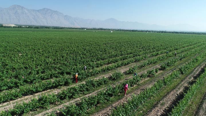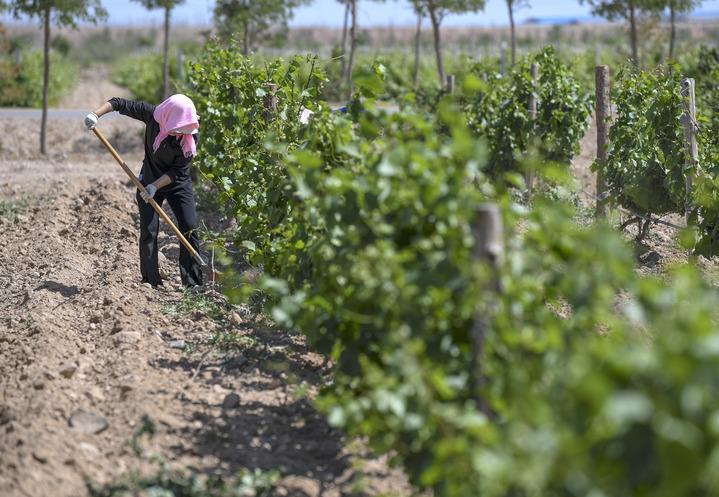 6月7日,在位于賀蘭山東麓的西鴿酒莊,一名工人在釀酒葡萄種植基地勞作。新華社記者 馮開華 攝