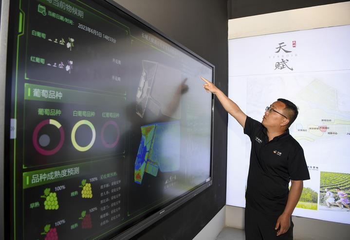6月5日,中糧長(zhǎng)城天賦酒莊總經(jīng)理都振江在介紹酒莊的智慧葡萄園灌溉數(shù)據(jù)平臺(tái)。新華社記者 馮開華 攝