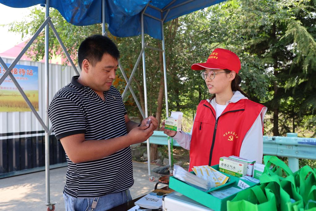 在G4京港澳高速邢臺(tái)北口,跨區(qū)機(jī)收接待服務(wù)站工作人員向農(nóng)機(jī)手發(fā)放防暑物品。新華社記者 鄒尚伯 攝