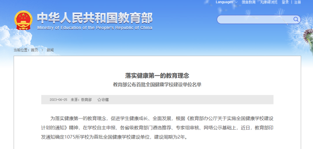 記者6月25日從教育部獲悉,為落實(shí)健康第一的教育理念,促進(jìn)學(xué)生健康成長(zhǎng)、全面發(fā)展,在學(xué)校自主申報(bào)、各省級(jí)教育部門遴選推薦、專家組審核、網(wǎng)絡(luò)公示基礎(chǔ)上,教育部近日印發(fā)通知,確定1075所學(xué)校為首批全國(guó)健康學(xué)校建設(shè)單位,建設(shè)周期為2年。