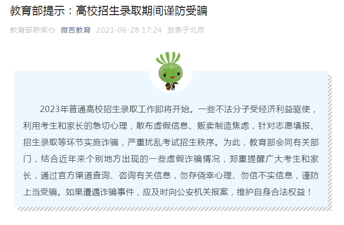教育部還提醒,要提高防范意識,妥善保管好自己的身份證號、考生號等個(gè)人信息和志愿填報(bào)系統(tǒng)密碼等登錄信息,不要泄露給他人,防止志愿被他人篡改。(記者王鵬)