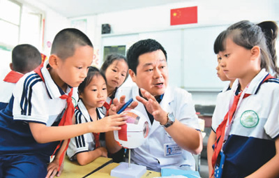 近日,在貴州省黔東南苗族侗族自治州從江縣城關(guān)第三小學(xué),眼科醫(yī)生給學(xué)生講解健康用眼知識(shí)。石宏輝攝(人民視覺(jué))