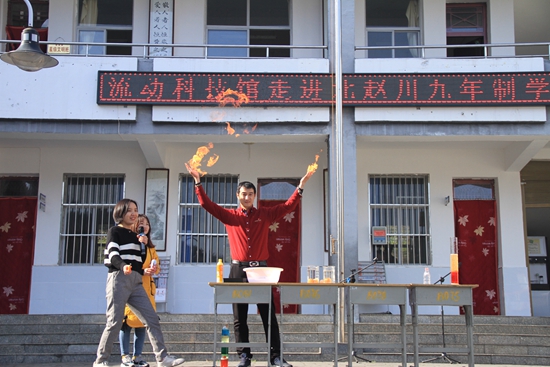 付佳樂與指導(dǎo)教師一起為丹鳳縣武關(guān)鎮(zhèn)北趙川九年制學(xué)校展示趣味科學(xué)實驗。受訪者供圖