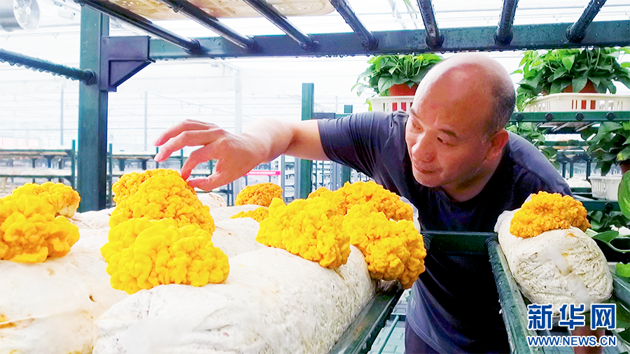 在金米智慧農(nóng)業(yè)產(chǎn)業(yè)園里,技術(shù)負責人陳盛林查看金耳長勢。新華網(wǎng) 楊喜龍 攝