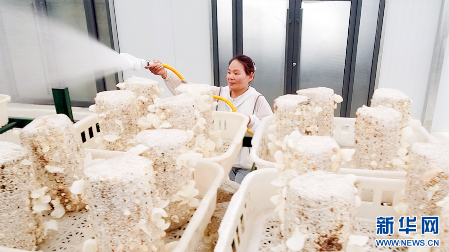 在金米智慧農(nóng)業(yè)產(chǎn)業(yè)園里,金米村村民張寨勤給大棚里的木耳補水。新華網(wǎng) 楊喜龍 攝