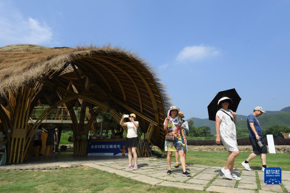 8月11日,游客在安吉余村參觀用當?shù)厥a(chǎn)的竹材料建造的建筑。