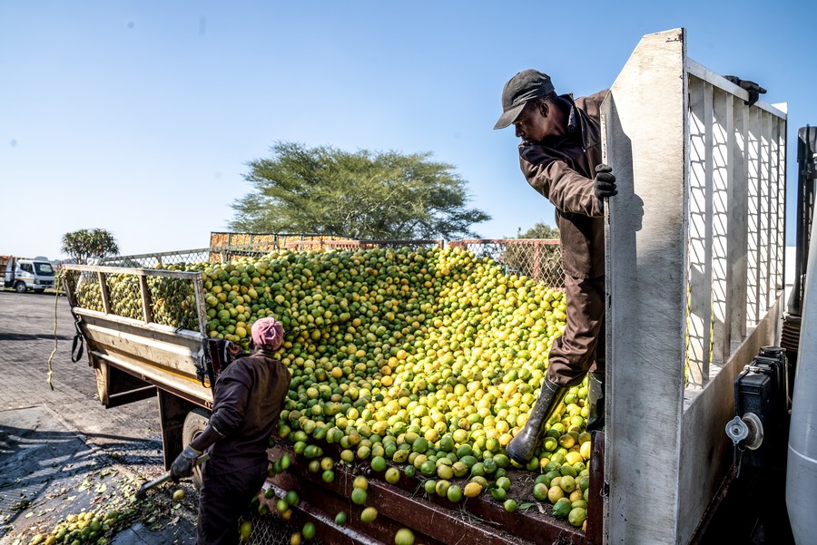 5月24日,工人在南非西北省一處榨汁工廠裝卸柑橘。(新華社發(fā),希拉茲·穆罕默德攝)