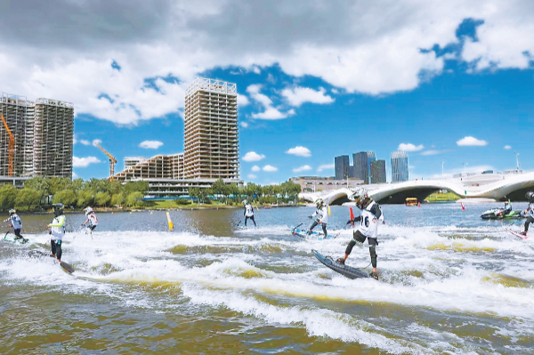今年7月,2023年全國(guó)電動(dòng)沖浪板聯(lián)賽(北京大運(yùn)河站)在北運(yùn)河開賽,這也是副中心在大運(yùn)河首次承辦國(guó)家級(jí)動(dòng)力板聯(lián)賽。活動(dòng)現(xiàn)場(chǎng),參賽運(yùn)動(dòng)員在風(fēng)景如畫的大運(yùn)河上踏浪飛馳,吶喊聲、歡呼聲在河兩岸此起彼伏,飛濺的浪花、激情的運(yùn)動(dòng)、歡樂(lè)的人群,共同構(gòu)成了一幅炫彩、活力的運(yùn)河新圖景。