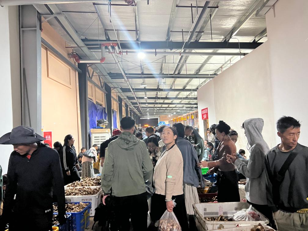 晚上11時,記者走進(jìn)當(dāng)?shù)厮扇捉灰资袌?,看到客商云集,門店前滿是用松茸堆成的小山。雖已入夜,市場內(nèi)人聲鼎沸,商戶達(dá)瓦央宗熱情地拉住記者,推銷自家采摘的松茸。詢問得知,這段時間,她和家人每天凌晨3點(diǎn)半摸黑出門,沿著山道來到家附近的青杠林采摘新鮮松茸,然后來市場交易,有時一忙就要持續(xù)到深夜。“一個松茸季下來,家里能增加五六萬元的收入。”
