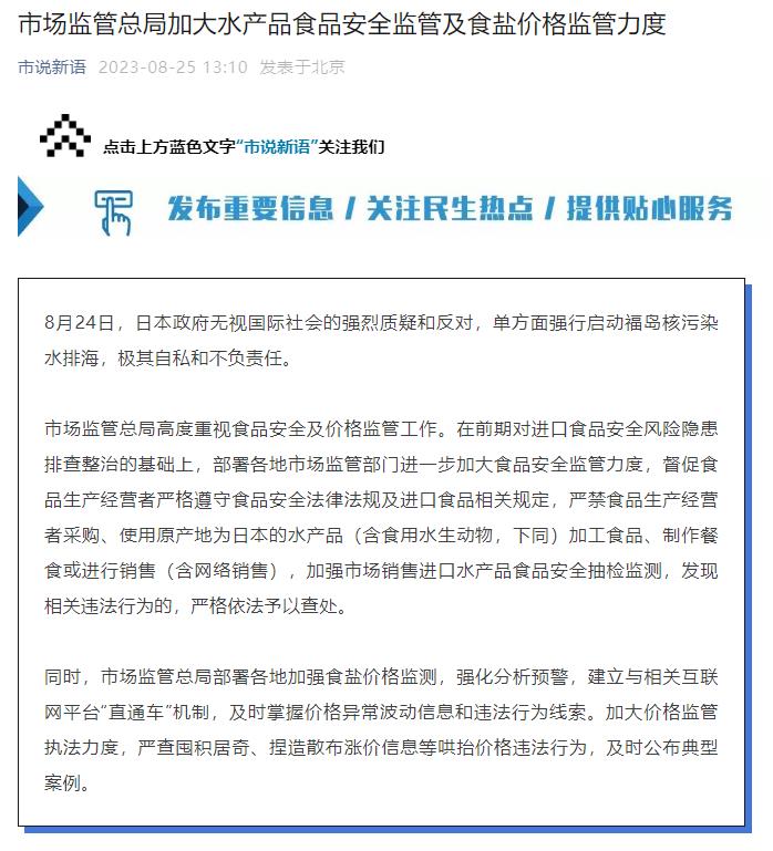 市場監(jiān)管總局高度重視食品安全及價格監(jiān)管工作。在前期對進(jìn)口食品安全風(fēng)險隱患排查整治的基礎(chǔ)上,部署各地市場監(jiān)管部門進(jìn)一步加大食品安全監(jiān)管力度,督促食品生產(chǎn)經(jīng)營者嚴(yán)格遵守食品安全法律法規(guī)及進(jìn)口食品相關(guān)規(guī)定,嚴(yán)禁食品生產(chǎn)經(jīng)營者采購、使用原產(chǎn)地為日本的水產(chǎn)品(含食用水生動物,下同)加工食品、制作餐食或進(jìn)行銷售(含網(wǎng)絡(luò)銷售),加強(qiáng)市場銷售進(jìn)口水產(chǎn)品食品安全抽檢監(jiān)測,發(fā)現(xiàn)相關(guān)違法行為的,嚴(yán)格依法予以查處。