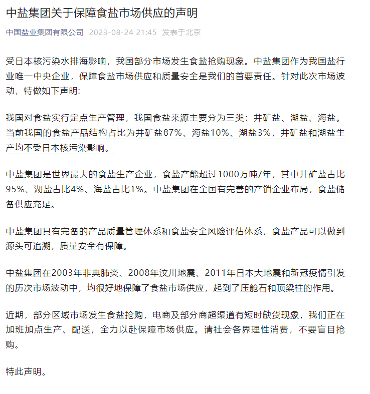 受日本核污染水排海影響,我國部分市場發(fā)生食鹽搶購現(xiàn)象。中鹽集團作為我國鹽行業(yè)唯一中央企業(yè),保障食鹽市場供應(yīng)和質(zhì)量安全是我們的首要責(zé)任。針對此次市場波動,特做如下聲明: