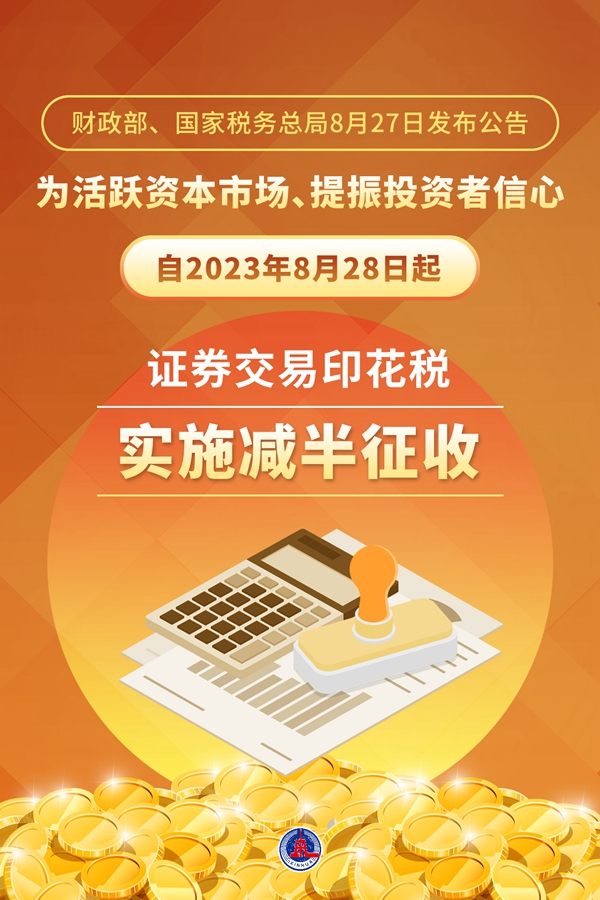 新華社北京8月27日電 記者27日從財(cái)政部了解到,財(cái)政部、國家稅務(wù)總局當(dāng)日發(fā)布公告稱,為活躍資本市場(chǎng)、提振投資者信心,自2023年8月28日起,證券交易印花稅實(shí)施減半征收。