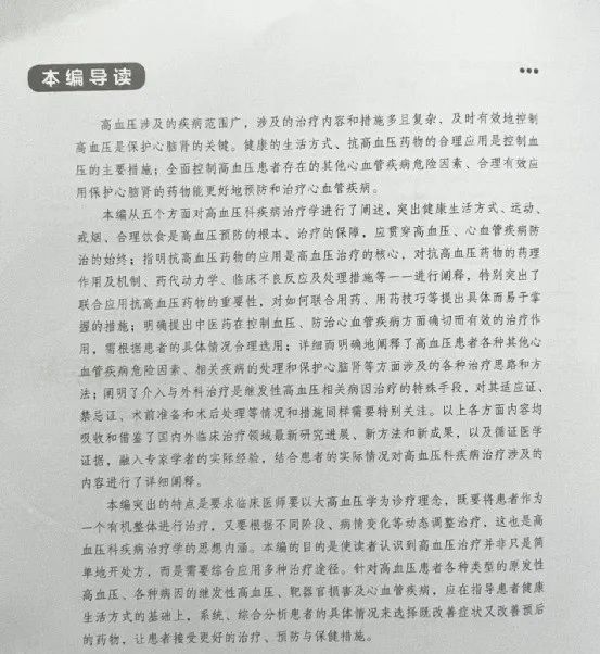 該書每一編都有一個(gè)導(dǎo)讀,指導(dǎo)讀者怎樣學(xué)習(xí)使用相關(guān)內(nèi)容,在閱讀每編、章、節(jié)前都能構(gòu)建好系統(tǒng)的理論知識(shí)框架,順利把握好各章節(jié)中的重點(diǎn)、難點(diǎn)及疑點(diǎn),更好地汲取書中的教學(xué)方法及研究成果。如第四編“高血壓科疾病治療學(xué)”從健康生活方式、抗高血壓藥物、中醫(yī)藥、相關(guān)疾病處理和介入與外科手術(shù)等五個(gè)方面對(duì)高血壓科疾病治療學(xué)進(jìn)行了闡述。反映了高血壓涉及的疾病范圍廣,涉及的治療內(nèi)容和措施多且復(fù)雜,及時(shí)有效地控制高血壓是保護(hù)心腦腎的關(guān)鍵。健康的生活方式、抗高血壓藥物的合理應(yīng)用是控制血壓的主要措施;全面控制高血壓患者存在的其他心血管疾病危險(xiǎn)因素、合理有效應(yīng)用保護(hù)心腦腎的藥物能更好地預(yù)防和治療心血管疾病。
