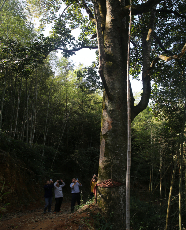 若非親眼所見,簡直難以置信,眼前是一棵三個成年男子都難以環(huán)抱的含笑,一棵常被用來點(diǎn)綴的綠化樹,竟長成二三十米高的參天大樹,它長出了人們的經(jīng)驗(yàn)范疇,讓人一下失去贊美的語言。這么高大的含笑不要說是全縣,就是全市、全省甚至全國也為之罕見。巧的是,這棵參天大含笑,又恰好長在必經(jīng)之地的古道山蔭處,自然為世人所銘記。