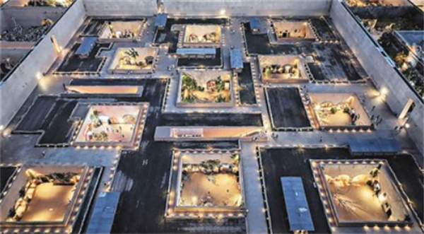 這座“戲劇幻城”從盲盒中創(chuàng)意取材,用夯土城墻合圍出方正的空間,并劃分出56個完全不同的格子,打造了21個劇場和不同風(fēng)格的景觀院落。游客可以在格子中穿行,分別進(jìn)入不同時期、不同主題的戲劇空間觀演。置身其中,在LED光影技術(shù)、“聲光電畫”一體化數(shù)控系統(tǒng)的輔助下,游客可以回到紅廟學(xué)校,重溫童年時的課堂時光;“穿越”到1942年,體驗李家村人逃荒的艱辛;來到“天子駕六遺址坑”與想要預(yù)見未來的周天子進(jìn)行“時空對話”……