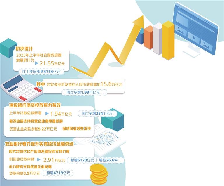 今年上半年以來,金融持續(xù)支持實體經(jīng)濟恢復發(fā)展和回升向好,金融體系對實體經(jīng)濟的支持進一步加大。初步統(tǒng)計,2023年上半年社會融資規(guī)模增量累計為21.55萬億元,比上年同期多4754億元。其中,對實體經(jīng)濟發(fā)放的人民幣貸款增加15.6萬億元,同比多增1.99萬億元。