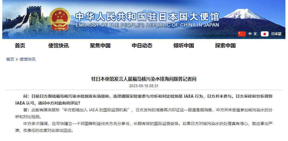 央視網(wǎng)消息:據(jù)中國(guó)駐日本大使館網(wǎng)站消息,駐日本使館發(fā)言人就福島核污染水排海問(wèn)題答記者問(wèn)。內(nèi)容如下:
