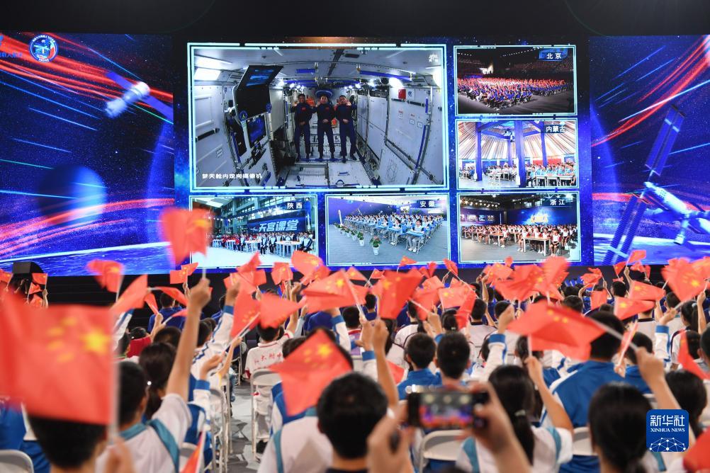 新華社北京9月21日電 9月21日下午,“天宮課堂”第四課在中國空間站開講,新晉“太空教師”景海鵬、朱楊柱、桂海潮為廣大青少年帶來一場精彩的太空科普課,這是中國航天員首次在夢天實驗艙內進行授課。
