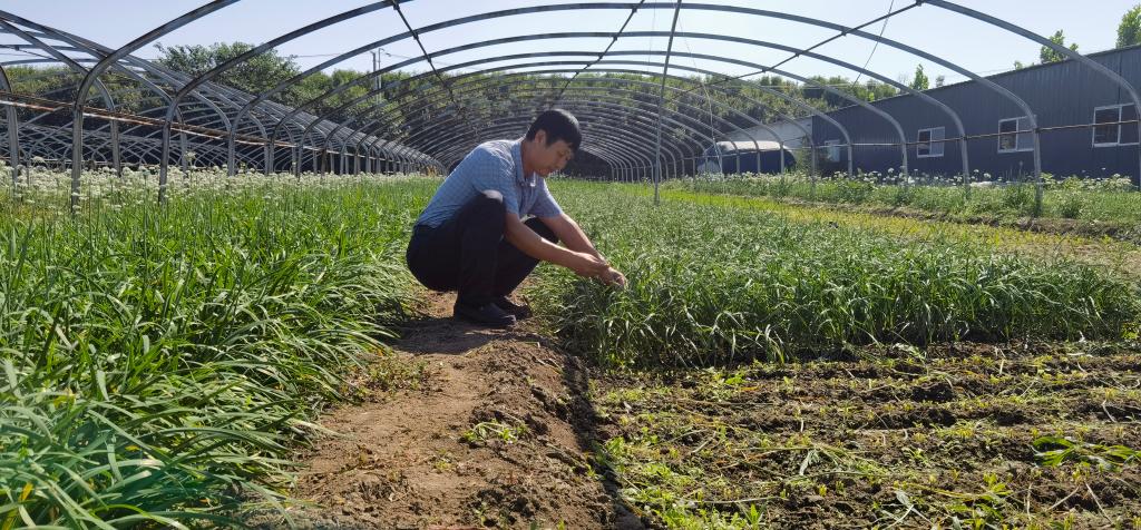 山東省壽光市文家街道西蔡家營(yíng)村黨支部書(shū)記鐘明正在查看即將收獲的韭菜。新華社記者葉婧 攝