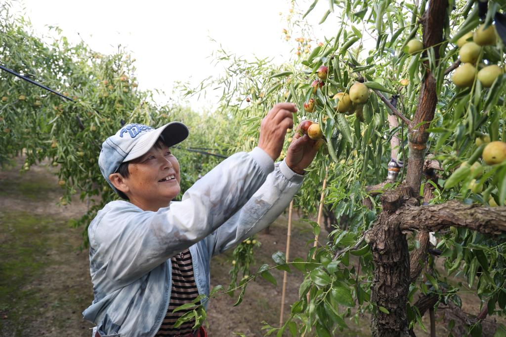 在山東省濱州市沾化區(qū)古城鎮(zhèn),棗農(nóng)正在采摘冬棗。新華社記者高天 攝