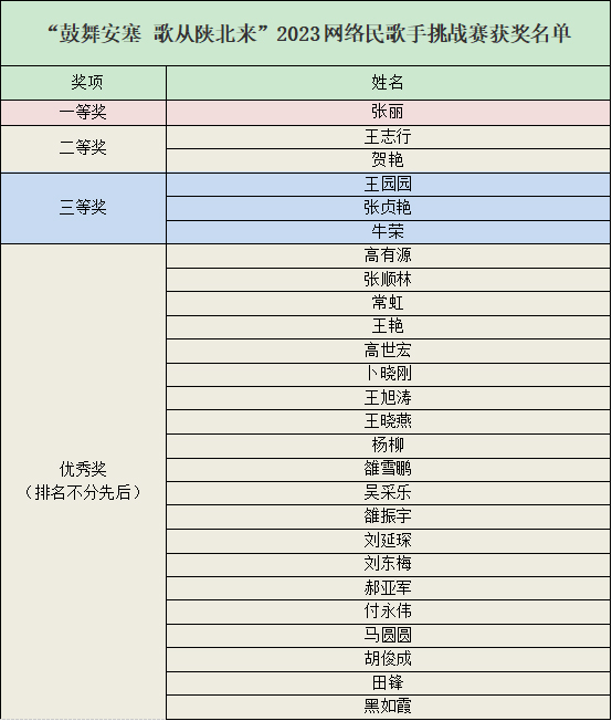 決賽現(xiàn)場,參賽選手們依次上場深情獻唱,《一對對鴛鴦水上漂》《小桃紅》《走西口》等經(jīng)典的陜北民歌喚起在場群眾陣陣掌聲。最終,經(jīng)過一番精彩獻唱,專家評審團現(xiàn)場打分決出“鼓舞安塞 歌從陜北來”2023網(wǎng)絡(luò)民歌手挑戰(zhàn)賽一、二、三等獎獲獎選手及優(yōu)秀選手。其中,張麗獲得一等獎,王志行、賀艷獲得二等獎,王園園、張貞艷、牛榮獲得三等獎,因4名民歌歌手棄權(quán)比賽,剩余20名民歌歌手均獲優(yōu)秀獎。