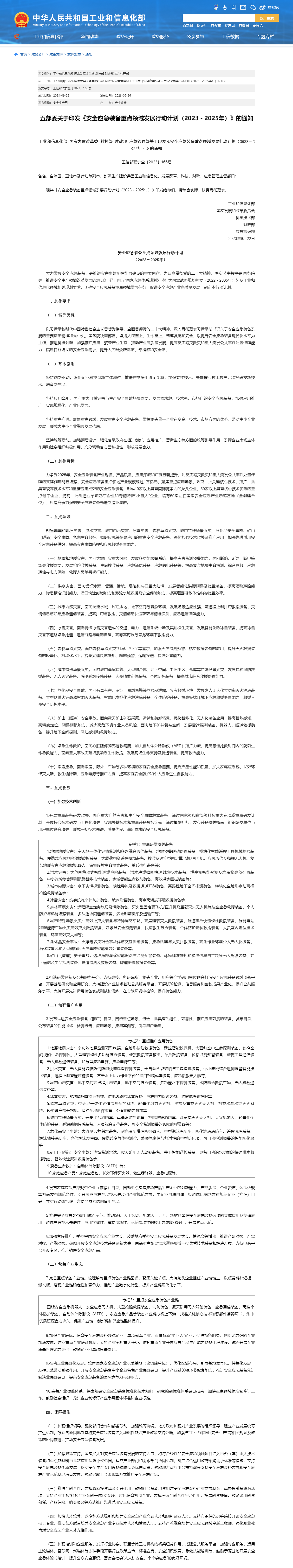 工信部官網(wǎng)消息,近日,工業(yè)和信息化部、國家發(fā)展改革委、科技部、財政部、應急管理部等五部門聯(lián)合印發(fā)《安全應急裝備重點領域發(fā)展行動計劃(2023-2025年)》。其中提出,力爭到2025年,安全應急裝備產(chǎn)業(yè)規(guī)模、產(chǎn)品質量、應用深度和廣度顯著提升,對防災減災救災和重大突發(fā)公共事件處置保障的支撐作用明顯增強。安全應急裝備重點領域產(chǎn)業(yè)規(guī)模超過1萬億元。聚焦重點應用場景,攻克一批關鍵核心技術,推廣一批具有較高技術水平和顯著應用成效的安全應急裝備,形成10家以上具有國際競爭力的龍頭企業(yè)、50家以上具有核心技術優(yōu)勢的重點骨干企業(yè),涌現(xiàn)一批制造業(yè)單項冠軍企業(yè)和專精特新“小巨人”企業(yè),培育50家左右國家安全應急產(chǎn)業(yè)示范基地(含創(chuàng)建單位),打造競爭力強的安全應急裝備先進制造業(yè)集群。