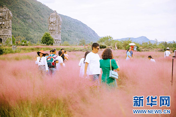 疊石花谷粉黛季拉開帷幕,微風拂過,輕柔的粉黛花穗隨風搖曳,充滿浪漫氣息,與疊石景觀相映成趣,令人流連忘返。景區(qū)在花海中設置了文案路牌、云朵氣球、尋夢秋千等多組網(wǎng)紅打卡裝置,為廣大游客提供花海打卡點,樂享秋日夢幻和浪漫,留下旅行的美好回憶。