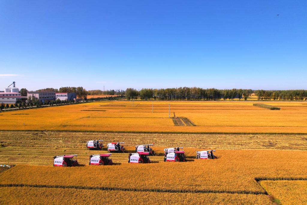 黑龍江省綏化市北林區(qū)的水稻科技示范田里正在進(jìn)行收獲作業(yè)。新華社發(fā)(蔣寶棟攝)