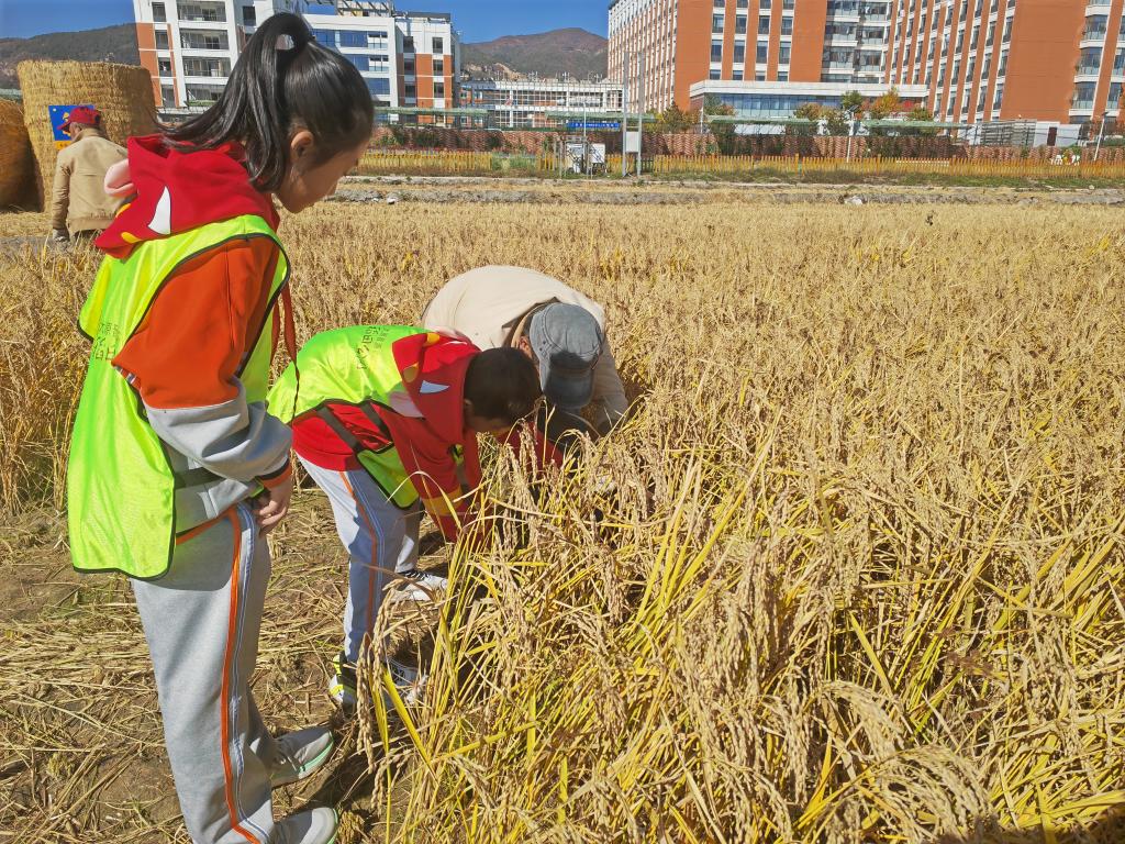 10月20日,小學(xué)生在工作人員的帶領(lǐng)下體驗收割水稻。新華社記者 魏飚 攝