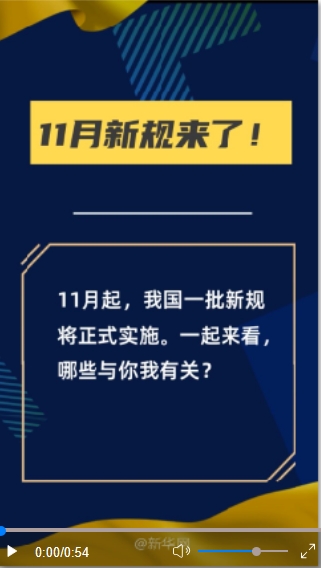 11月起,一批新規(guī)將正式實(shí)施。一起來看,哪些與你我有關(guān)?(文字來源:新華社 視頻剪輯:盧俊宇 終審:陳競(jìng)超)