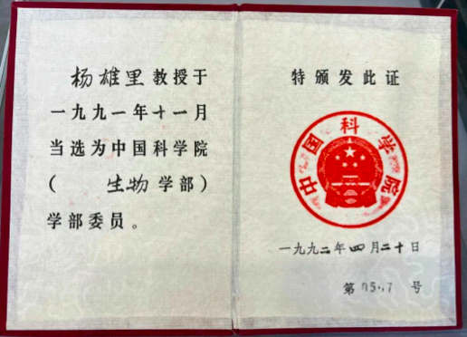 證書(shū)左側(cè)頁(yè)上寫著:“楊雄里教授于1991年11月當(dāng)選為中國(guó)科學(xué)院生物學(xué)部委員。”這里所說(shuō)的學(xué)部委員就是現(xiàn)在我們熟知的中國(guó)科學(xué)院院士。