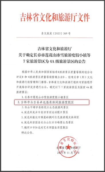 近日, 根據(jù)國家《旅游景區(qū)質(zhì)量等級的劃分與評定》和《旅游景區(qū)質(zhì)量等級管理辦法》,經(jīng)相關(guān)部門推薦,吉林省文化和旅游廳組織專家按程序開展綜合評定并進(jìn)行公示,確定金恪集團(tuán)旗下吉林卓遠(yuǎn)溫泉休閑旅游度假區(qū)等7家旅游景區(qū)成為國家4A級旅游景區(qū)。