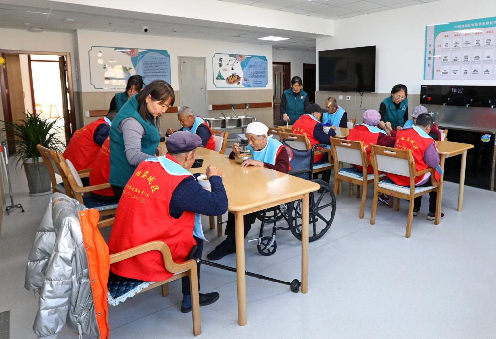 2023年11月18日,中陽縣城區(qū)幸福養(yǎng)老服務(wù)中心老年人在就餐。張旭盛 攝
