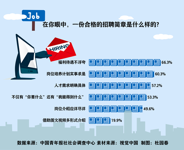 日前,中國青年報社社會調(diào)查中心聯(lián)合問卷網(wǎng)(wenjuan.com),對1334名應(yīng)屆大學(xué)生進行的一項調(diào)查顯示,在他們眼中,一份合格的招聘簡章,首先是福利待遇不浮夸(66.3%),其次是崗位培養(yǎng)計劃實事求是(60.3%),再次是人才需求明確具體(57.2%)。