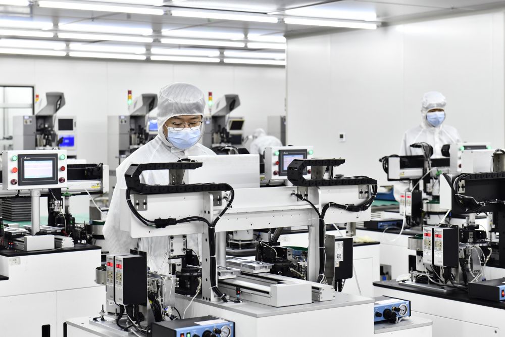 2023年6月29日,在山東省日照高新技術(shù)產(chǎn)業(yè)開(kāi)發(fā)區(qū)智慧微電產(chǎn)業(yè)園,工作人員在生產(chǎn)濾波器。新華社記者 郭緒雷 攝