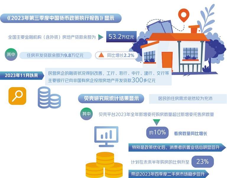 從銀行信貸角度看,房地產(chǎn)信貸融資的規(guī)模、結(jié)構(gòu)整體穩(wěn)定?!?023年第三季度中國(guó)貨幣政策執(zhí)行報(bào)告》顯示,全國(guó)主要金融機(jī)構(gòu)(含外資)房地產(chǎn)貸款余額為53.2萬(wàn)億元,其中,住房開(kāi)發(fā)貸款余額為9.8萬(wàn)億元,同比增長(zhǎng)2.2%。2023年11月以來(lái),民營(yíng)房企的融資狀況得到改善,工行、農(nóng)行、中行、建行、交行等主要銀行已向非國(guó)有房企投放房地產(chǎn)開(kāi)發(fā)貸款300多億元。