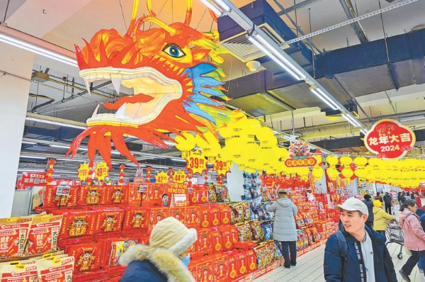 北京各大商超節(jié)日氛圍漸濃,在物美超市玉蜓橋店,新春節(jié)慶商品擺滿貨架,喜慶紅火的龍形掛飾裝點(diǎn)賣(mài)場(chǎng)。 記者 鄧偉攝