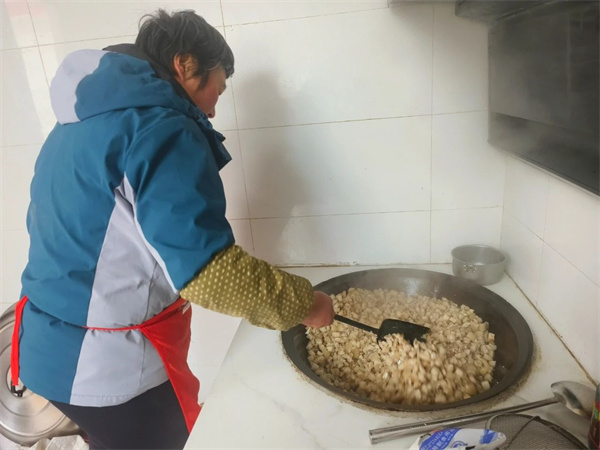 話語(yǔ)間,油鍋里的肉臊子“滋啦啦”地在鍋內(nèi)翻滾,白凈的肉丁逐漸變的金黃。