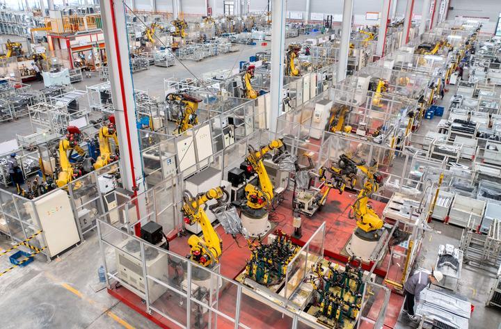2024年1月8日,在位于浙江省湖州市長興經(jīng)濟(jì)技術(shù)開發(fā)區(qū)的長興地通汽車部件有限公司,全自動(dòng)機(jī)器人高速運(yùn)轉(zhuǎn)生產(chǎn)新能源汽車配件訂單產(chǎn)品(無人機(jī)照片)。新華社發(fā)(譚云俸攝)