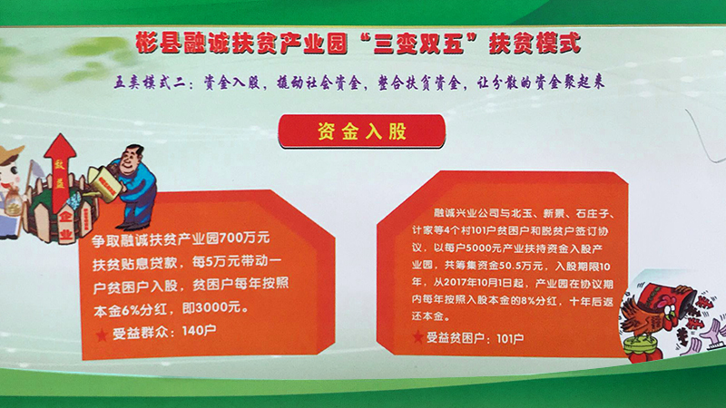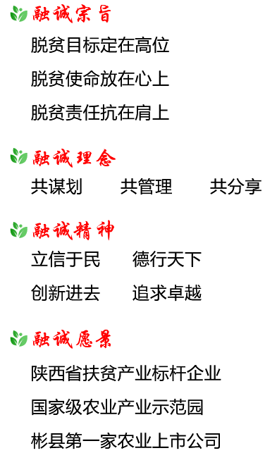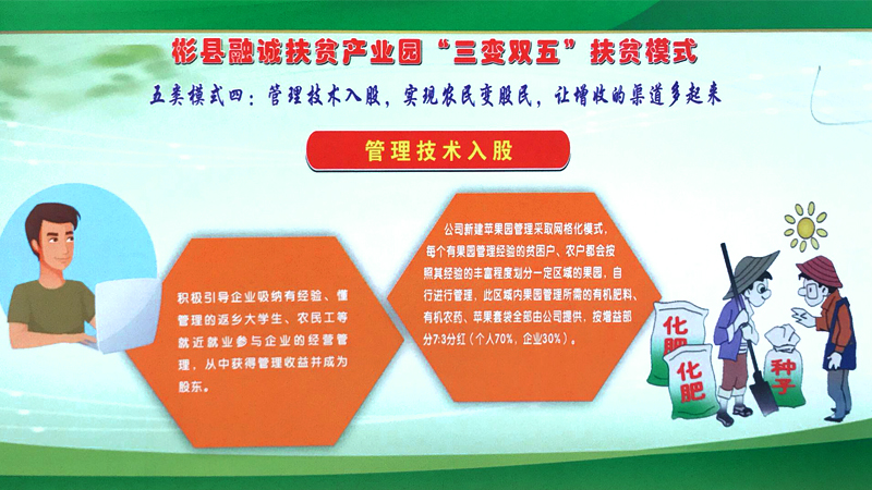 彬州融誠集團公司按照“企業(yè)主導、政府搭臺、群眾參與、社會共建”的思路,圍繞主導產(chǎn)業(yè),緊盯市場需求和脫貧政策動向, 在外出考察學習的基礎上,借鑒貴州省六盤水市“三變”改革的成功經(jīng)驗,以“資源變資產(chǎn)、資金變股金、農(nóng)民變股東”三變改革為基礎, 探索總結(jié)出了符合融誠實際的“三變雙五”新模式。